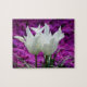 Ett litet pussel med 2 vita tulpaner på en fushia-flöt bakgrund.