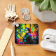 En kvinna framför en livfull, färgstark bakgrund