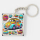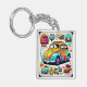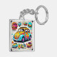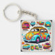 En färgstark illustration som visar en mängd olika Volkswagen Beetle-bilar i olika stilar och färg. Huvudbilden har en stor, multifärgad Beetle med en teal och orange, omgiven av en mindre, annorlunda färgad Beetles, inklusive rosa, blått och gult. Bilden ställs in mot en vit bakgrund med svart gräns och omfattar olika cirklar och linjer, vilket ökar den lekande och livliga atmosfären.