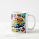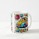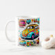 En färgstark illustration som visar en mängd olika Volkswagen Beetle-bilar i olika stilar och färg. Huvudbilden har en stor, multifärgad Beetle med en teal och orange, omgiven av en mindre, annorlunda färgad Beetles, inklusive rosa, blått och gult. Bilden ställs in mot en vit bakgrund med svart gräns och omfattar olika cirklar och linjer, vilket ökar den lekande och livliga atmosfären.