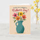 This card shows a deep teal pitcher with a light speckled texture sitting in the lower half of the design, like a cherished vase set out for someone special. From the narrow neck rises a full bouquet of stylized flowers in fuchsia, marigold yellow, fiery orange, and poppy red, with dark dotted centers that feel like little points of attention ❤️. Deep green leaves weave between the blooms, leaning toward each other as if in a gentle, friendly embrace. Small teal and olive dots drift around the bouquet like soft confetti, adding a light, airy touch 🌼. The background is a warm beige that keeps the scene calm while letting the colors stand out. Near the top, a short message appears in flowing crimson lettering, centered above the flowers and easy to spot at first glance. The pitcher’s rounded body and curved handle are shaded subtly, and the bouquet spreads upward in a loose, rounded shape with dots scattered in the open space around it.