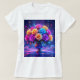A luminism image of a vibrant bouquet of roses arranged in a stunning, ornate vase, bursting with surreal neon colors and glowing gradients. The petals shimmer in electric oranges, pinks, purples, and blues, with swirling patterns and luminous highlights. The vase reflects a kaleidoscope of colors, surrounded by a soft mist of iridescent light and abstract shapes. AI generated image.