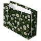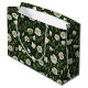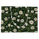 Seamless pattern of white and yellow daisies interspersed with green foliage against a dark forest green background.