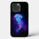 Stora, blå, konstnärligt ritade, glödande, ljusa maneter med långa tentakler på svart bakgrund med lila bioluminescens. Luminös maneter.