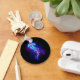 Stora, blå, konstnärligt ritade, glödande, ljusa maneter med långa tentakler på svart bakgrund med lila bioluminescens. Luminös maneter.