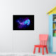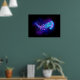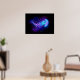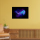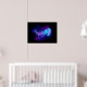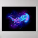 Stora, blå, konstnärligt ritade, glödande, ljusa maneter med långa tentakler på svart bakgrund med lila bioluminescens. Luminös maneter.