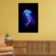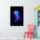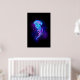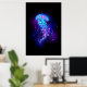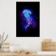 Stora, blå, konstnärligt ritade, glödande, ljusa maneter med långa tentakler på svart bakgrund med lila bioluminescens. Luminös maneter.