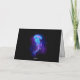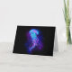 Stora, blå, konstnärligt ritade, glödande, ljusa maneter med långa tentakler på svart bakgrund med lila bioluminescens. Luminös maneter.