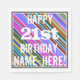 Den pappra napkin-designen med roligtens födelsedag innehåller ett meddelande som "LYCKLIG 21:a BIRTHDAY, NAMN-HERE!", där namn kan anpassas. Bakgrunden har ett dynamiskt, flerfärgat rand mönster. Meddelandetexten är vit färgad och ser illa ut. Napkins som dessa kan kanske användas i en födelsedagsfest till någon som firar sin tjugoförsta födelsedag. [~Z0000270]