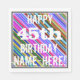 Den pappra napkin-designen med roligtens födelsedag innehåller ett meddelande som "LYCKLIG 45:e BIRTHDAY, NAMN-HERE!", där namn kan anpassas. Bakgrunden har ett dynamiskt, flerfärgat rand mönster. Meddelandetexten är vit färgad och ser illa ut. Napkins som dessa kan kanske användas i en födelsedagsfest till någon som firar sin fyrtiofemårsdag. [~Z0000270]