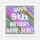 Den här roligtens pappra napkin-design med födelsedagstext innehåller ett meddelande som "LYCKLIG 5 BIRTHDAY, NAMN-HERE!". Bakgrunden har ett dynamiskt, flerfärgat rand mönster. Meddelandetexten är vit färgad och ser illa ut. Napkins som dessa kan kanske användas i en födelsedagsfest till någon som firar sin femte födelsedag. [~Z0000270]