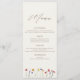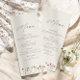 Den här enkla, moderna och vibrerande menyn för vilda blommor i bröllop är perfekt för ditt "jag gör", oavsett årstid. De vildblommor som finns på eleganten är både charmerande och förenklade med den sofistikerade pennans och groomens initialer på motsatt sida. Njut av bröllop i vår, sommar, fall eller vinter med vår vackra, färgstarka och minimala design.