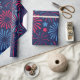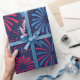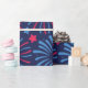 Ett lysande mönster med fyrverkerier som brinner i röda och blå skuggor mot en djup marin bakgrund. Stjärnor är spridda genom hela designen, vilket ger en festlig och festlig beröring.
