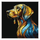 En nedfläckad glas-stil porträtt som fångar kärnan i ett hund huvud. Med blått, gult, orange och guldfärgat färg har den här konstnärliga skapelsen en fantastisk abstraktion mot mörkens bakgrund.