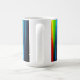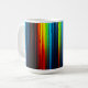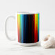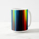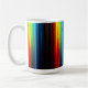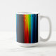 A white mug with a vibrant abstract design of colorful, glowing vertical stripes resembling a light spectrum on a dark base. (124 caractères)