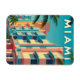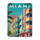 Colorful illustration of iconic Miami architecture featuring geometric patterns, pastel colors, and lush palm fronds casting shadows.