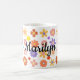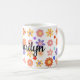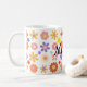 Brighten up your mornings with this beautifully personalized ceramic mug. Decorated with a vibrant mix of colorful flowers—red, orange, yellow, purple, and pink—it brings cheerful energy to every sip. Nestled among the blooms is a subtle peace symbol, adding a touch of positivity and harmony. The centerpiece of the design is the elegant black cursive editable name making this mug a truly unique and thoughtful gift.