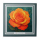 This ceramic tile features a vibrant orange rose rendered in a layered paper-cut style, radiating warmth and elegance. The richly textured petals glow against a deep teal background with flowing ornamental accents, creating a striking contrast. Ideal as decorative wall art, a kitchen or bathroom accent, or a unique gift, this floral tile blends classic botanical beauty with modern artistic depth for timeless home décor appeal.