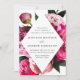Elegantens bröllopsinbjudningar i blommigten som innehåller dina bröllop-uppgifter inuti en diamant ram, omgiven av vackra levande rosa och rosor med löv i lush grönt. Bröllopet bjuder tillbaka till en ljus rosa bakgrund med utrymme för ytterligare text och bilder.