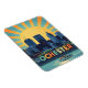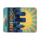En stiliserad illustration av Rochester, New York-skyline, batiserade i den varma glöden av ett sol med en båt på floden.