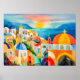 En livlig oljemålning av abstrakten på Santorinis namnteckning domer och viftade hem, badade i ett spektrum av ljusa knutar i Medelhavsområdet. Den feta sammansättningen utstrålar energi och värme.