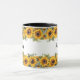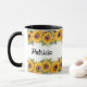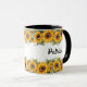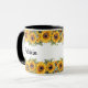 Personlig 1 namn trendig blommar moderna solblommor med två ton mugg på vit bakgrund. Mugg gör en perfekt födelsedagspresent eller en present till ett speciellt tillfälle. Anpassningsbar mugg med en namn för en unik beröring, eller som en självrannsakan.