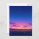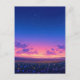 This ethereal postcard captures the magical transition between day and night over a sprawling countryside. The foreground is alive with a lush carpet of blue, purple, and yellow wildflowers nestled in deep green grass. As the eye moves toward the horizon, a brilliant pink and orange sunset glow warms the sky before deepening into a vast, star-studded indigo. Soft purple clouds drift across the center, adding depth to the celestial display. With its dreamlike atmosphere and high-contrast color palette, this piece evokes a sense of profound peace and natural wonder. This postcard is a beautiful choice for sending a hopeful message, a nature-inspired greeting, or as a serene decorative keepsake.