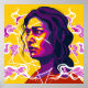 This is a colorful and stylized digital illustration featuring a portrait of a person with dark, wavy hair, rendered in vibrant shades of yellow, purple, orange, and white. The face is in profile, looking towards the left, with striking orange eyes. The background is a bright yellow with abstract white lines forming geometric shapes and flowing purple and white smoke-like elements. The overall style is bold, graphic, and somewhat surreal, with a modern and psychedelic aesthetic. The abstract elements surrounding the portrait add an artistic and intriguing dimension, possibly representing thoughts, energy, or a dreamlike state. The use of vivid colors and contrasting tones creates a visually captivating image.
