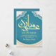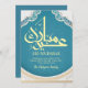 This card features a stunning turquoise blue background with traditional Islamic geometric motifs. The white and gold frame provides a modern and fresh look for your holiday greetings.