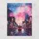 Ett enastående, modernt vykort i Nashville, USA, med en nostalgisk röd flytta längs belysta stadsgator vid solnedgången. himmel är målat med dramatiska skuggor av rosa, blått och lila, som sömlöst blandas i ett vattenfärgsinspirerat stil. Neonbelyst byggnad, gatuskyltar och ett storartat stadsliv skapar en atmosfärisk och livfull stadsplats, som fångar själva kärnan i musikstadens livliga nattliv.