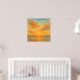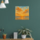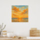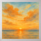 Artwork of sunset horizon over the sea in a watercolor painting style. The sky is ablaze with billowing clouds of deep tangerine, amber, and gold, broken up by patches of brilliant azure blue. Below, the ocean mirrors the fiery sky, blending warm orange reflections with cool, deep teal waters. The sun sits right on the horizon line, casting a shimmering path of light across the waves. This artwork embodies the spirit of an endless summer with its intense, glowing horizon. The rich golds and deep blues evoke memories of tropical getaways and warm sea breezes. This is a high-energy piece perfect for brightening up living rooms, entryways, or any room that needs a splash of vibrant color.