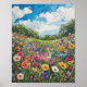 This vibrant painting depicts a field of wildflowers under a bright blue sky. Featuring daisies, poppies, and other blooms in shades of orange, pink, red, blue, and white, the artwork captures a lush, lively scene. The clear sky with fluffy white clouds adds depth, while the impressionistic style with bold brushstrokes and vivid colors evokes a cheerful, sunny day. Perfect for brightening up any room with a touch of nature.