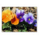 Orange och blåvioletta pansier blåser under våren genom fallande höst löv.