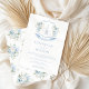 Förbered dig på en förfinad sofistikering med den här eleganten Viktorianska Franskens bröllopsinbjudan, som innehåller snygga illustrationer av ljusblåa och vita blommor som bildar ett krig på vintagens vapensköld med brud och groommongram inuti. Perfektens val att ge dig charm i vår eller sommartid i firande, den här inbjudan fångar den klassiska skönhetens kärna.