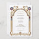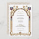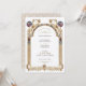 Gå in i gårdagens grandeur med vår inbjudan till Victorian Elegance Bröllop spara datum. Biet framför den här exquisite visar upp en strålande gyllene ram med en massa blommor i djup burgundi, midnattblått och tips från ro rosa, allt mot en grym bakgrund. Törningar av ornat golden scrollwork, inspirerat av den utsökta estetiken från Viktorianska tidsåldern, tillför ett regalt fläck till detta tillkännagivande. I stället fortsätter inbjudan att hyllas till den klassiska elegansen med en sömlös mönster av sammanlåsande gyllene loppurs-de-lis, vilket ge dina gäster en smak av den opulens och romantik som kan förväntas på er speciella dag. Denna inbjudan är en perfekt som föregår ett bröllop som är präglat av traditionell charm och sofistikerat stil.