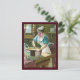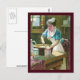 En kvinna använder en träsked för att blanda kakdeg i en stor skål i detta antika Viktorianska handelskort från 1880-talet. Det finns kryddor på redot bord för använda. Dam bär en bustle, en apron och en lacy kerChief på huvudet.