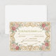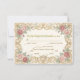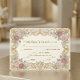 Transporter dina gäster till en sago-romans med detta vintage-inspirerade svarsbrev, med antika detaljer och en formell förfrågan om deras närvaro. Denna design har en sofistikerad flattryckt simulering av en antikt estetiskt uttryck. Bakgrunden är en tryckt effekt som liknar åldrigt cremefärgat pergamentpapper, vilket ger en varm och nostalgisk bas. Texten ramas in av en utsmyckad, symmetrisk barockrullverkskant i en tryckt falsk guldton, med accentuerande vattenfärgillustrationer av rosor i blekrosa och mjuka, gröna bladslingor. En delikat kerubillustration förankrar den nedre mitten, vilket förstärker det klassiska viktorianska inflytandet. Typografin kombinerar ett elegant kalligrafiskt skript för namn med en traditionell serif-teckensnitt för detaljerna. Detta