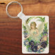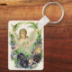 Gammal religiös kristen illustrationsbild med en viktoriansk ängel omgiven av penséblommor. Vacker blomsterbild för påsksäsongen. Viktoriansk utstansning.