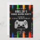 Videospelets Party-styrenhet Neon Gaming Birthday-inbjudan. Spelkontroll på en levande, färglös nybörjare ljus mot svart bakgrund.
