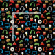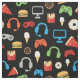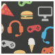 Tyg för mönster för mellanmål för Gamer för videospelpartyungar. Videospelkontrollant-, hörlurar-, pizza-, donuts-, hamburgare-, glass- och småfiskmönster på svart bakgrund. Rolig för barn för mönster för gamervideospelparty. www.SamAnnDesigns.com