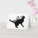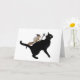 En liten häxekorre som håller en aknpersonal rider en svart katt på detta Halloween- eller Samhain-kort.