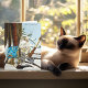 En norsk skogskatt är sitta bredvid ett träd med en blå drake sitta på en slaghjälm, Snö runt dem och ett svärd bakom dem med en vild slagax bredvid dem