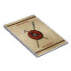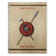 En 3d-återgivning av en Viking-sköld tillsammans med ett slagax och ett spjut som läggs ovanpå en gammal papper bild eller ett gammalt bakgrundsbild av ett stycke. Skölden dekoreras med en svart korv (Corvus corax) som är målad på rött läder. Det finns två ställarna för er att lägga till er egen text. De metoder och material som användes vid konstruktionen av Viking-sköldar varierade med ställe och tid. Denna återuppbyggnad bygger på kända exempel. Norse sköldar, till skillnad från dem som andra grupper gjort, framställs ofta av relativt mjuk skogen, såsom poppar och björk. Detta bidrog, avsiktligt eller på annat sätt, till att skölden absorberade ett slag utan att misslyckas. Och i stället för ett fast biet av trä gicks med vågrät plankar - vilket framgår av de bulthuvuden som ses på framsidan av denna sköld - för att förhindra att det spottas längs kornen. För att ytterligare minska risken för skada täcktes sköldens ansikte ofta av läder och en läderremsa tillsattes. Bägge absorberade blåsor och skyddade det underliggande träet. Den tarmformade metall chef i mitten skyddade krigarens hand.