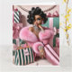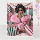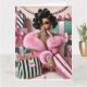 Stilfull kvinna omgiven av rosa och gröna julklappar