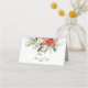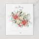 Julbukett med vit ros, poinsettias, bär och evergreen foliage. Enkla platskort med elegans för en julafton bröllop. Gör ställe-inställningarna extra speciella! Byt ut hälsning mot par namn mot en julsäsong bröllop eller en årsdag. Front har riktlinjer för gästhandskrivet namn och bordsnummer.