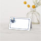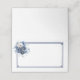 Detta vikta namnplatskort visas i grundläggande vitt med en vacker blomsterkvast i djupblå färger.