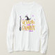 Den här roligten Halloween-skjortan har en häxhatt och pjäs och det står Witch och Berömd i orange och lila.