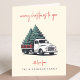 En festlig julkort på 5x7 med faltet design och den glada rubriken ”Merry Christmas to you” i modern röd handskriven typsnittstypografi som kombineras med en vintageinspirerad grafik för en julgranskyltbil. Designad på en vintagekrämfärgad bakgrund, denna stilrena retro-kort kombinerar nostalgisk charm med en modern minimalistisk layout. Personalisera ”with love from”-delen och under med ditt familjenamn i kompletterande typsnitt för en varm och anpassad touch. Perfekt för att dela kärlek och julhälsningar, denna icke-fotografiska, roliga och klassiska design tillför personlighet till säsongen samtidigt som den sprider festlig glädje. En tidlös juldesign som passar lika bra för familjer, individer och par.