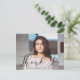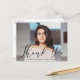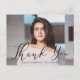 Enkel, stilren examens tack-kort med examenkandidatens horisontella foto och "Tack" i en elegant svart skriptöverlägg. Personifiera framsidan av examens tack-kortet genom att lägga till examenkandidatens namn och examensår. Baksidan av kortet visar din returadress och valfritt meddelande. Fototack-kortet är perfekt för både gymnasie- och högskoleexaminerade.