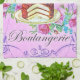 En skylt från vintagens konditorivaror med en chokladkaka och blommor. I färg av rosa och lila.